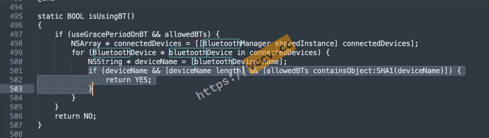 | if (deviceName && [deviceName length] && [allowedBTs containsObject:SHA1(deviceName)]) {