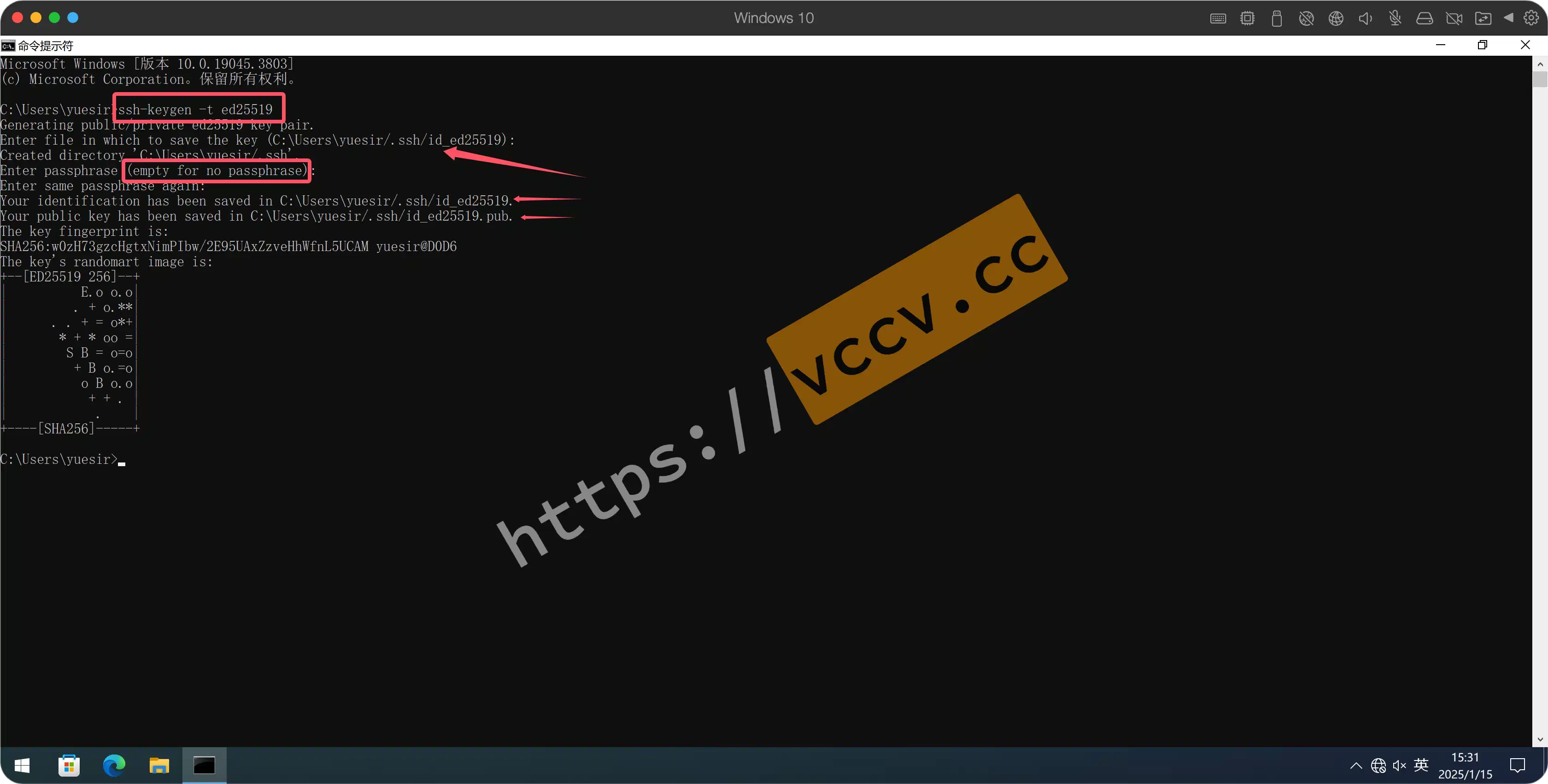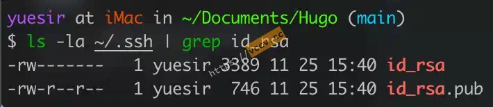 系统会提示输入文件保存路径以及安全密码,都可以直接输入回车(Enter),相当于将密码留空,同时默认的保存路径在宿主机的用户主目录的.ssh目录下。例如,如果我的宿主机用户名都是yuesir,那么在Windows系统中通常是C:/Users/yuesir/.ssh,macOS上通常是/Users/yuesir/.ssh,Linux上通常是/home/yuesir/.ssh。