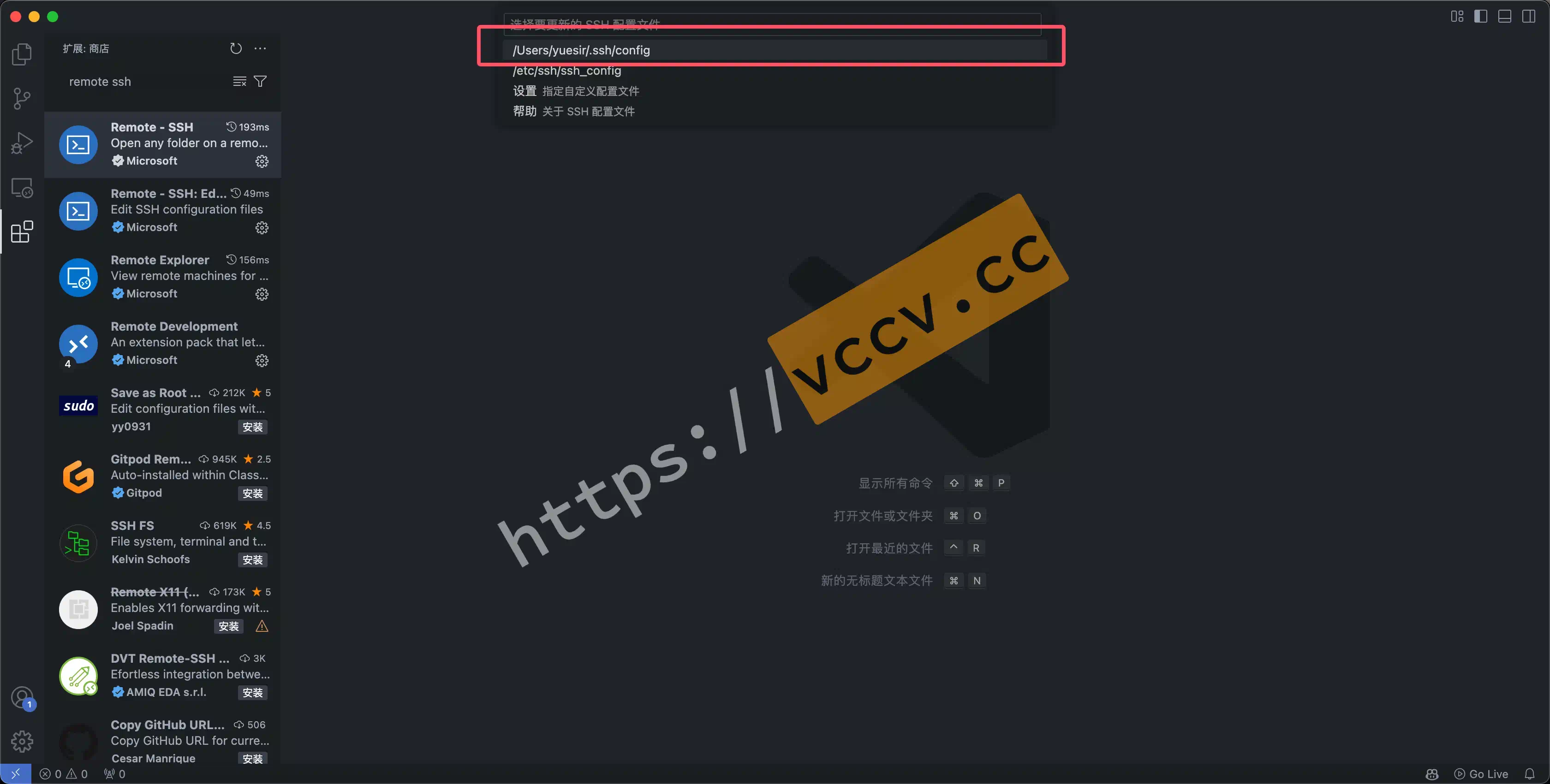 通过输入ssh命令成功连接到服务器后,vscode会自动将远程服务器相关配置信息保存到config配置文件中,理所当然的可以直接编辑config文件达到与命令一致的效果。点击连接到主机 -> 配置SSH主机后,通常选择自己用户目录下的.ssh/config文件,如图就是yuesir用户。