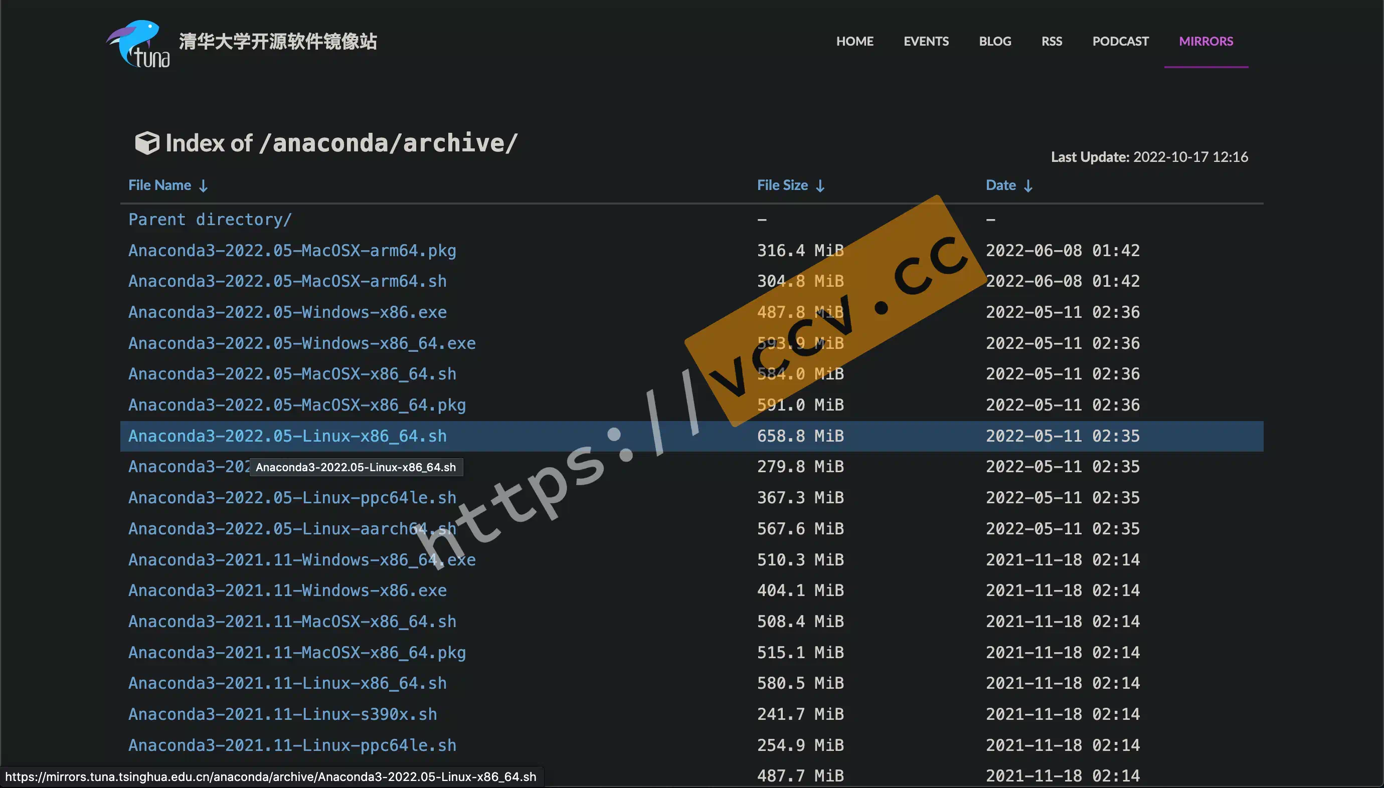 # Download scriptwget https://mirrors.tuna.tsinghua.edu.cn/anaconda/archive/Anaconda3-2022.05-Linux-x86_64.sh