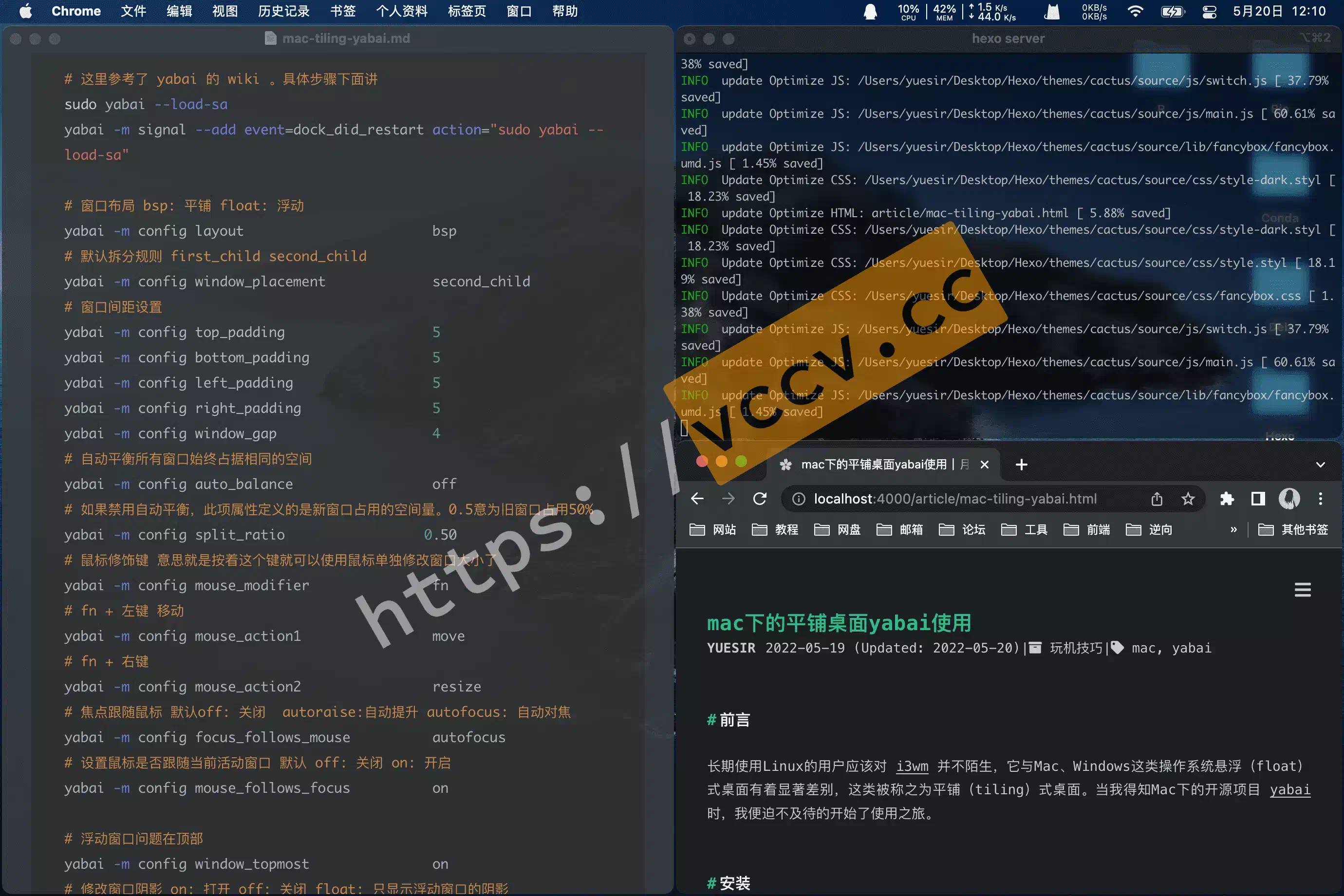Preface# Long-time Linux users should be familiar with i3wm , which is significantly different from the floating (float) desktops of Mac and Windows operating systems, which are called tiling desktops. When I learned about the open source project yabai for Mac, I couldn’t wait to start using it.